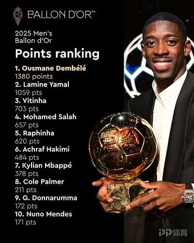 官方消息,金球奖官方公布了本届的具体分数,登贝莱1380分第一,亚马尔1059分。登贝莱领先亚马尔321分,而且100位评委有73人将第一投给了登贝莱,亚马尔只有11票第一。